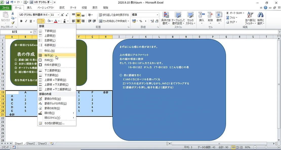 ここでは、表のもととなる罫線(線)を引く事を説明しています。