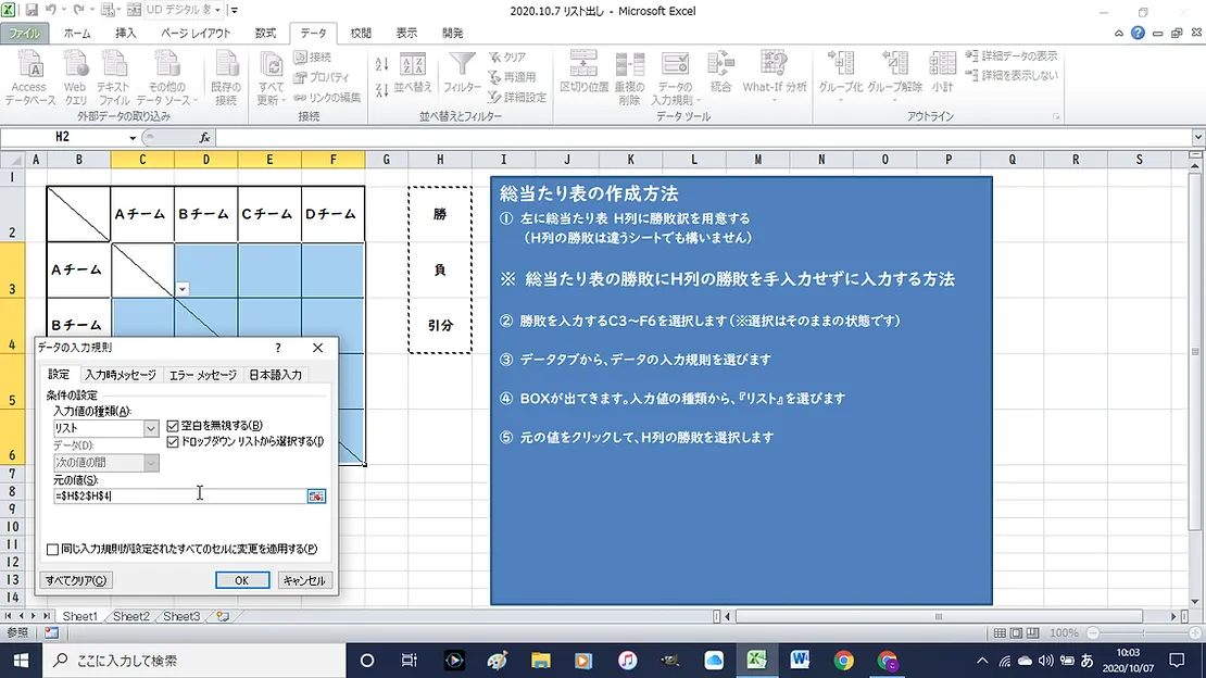 ⑤ リストを選択したら、元の値にH列2~4の勝敗を選択する