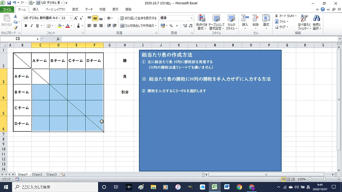 ② C3からF6までが勝敗を入力する欄となり、選択する