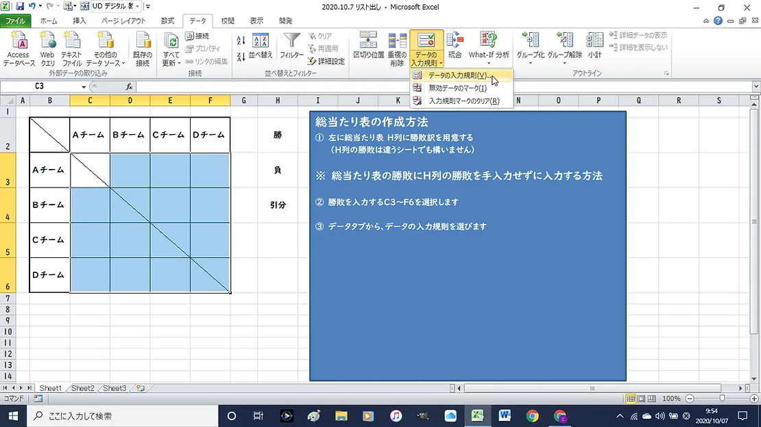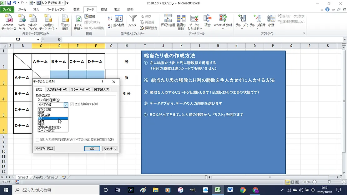 ③ セルを選択後、『データ』タブから、『データの入力規則』を選びます