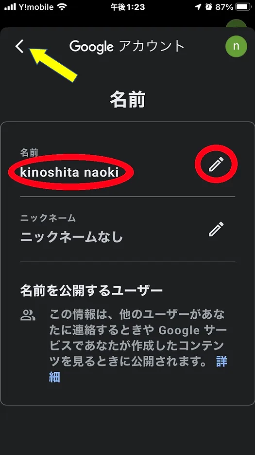 お名前にニックネームなどを入力し終えたら、左上の黄色の←を指している
